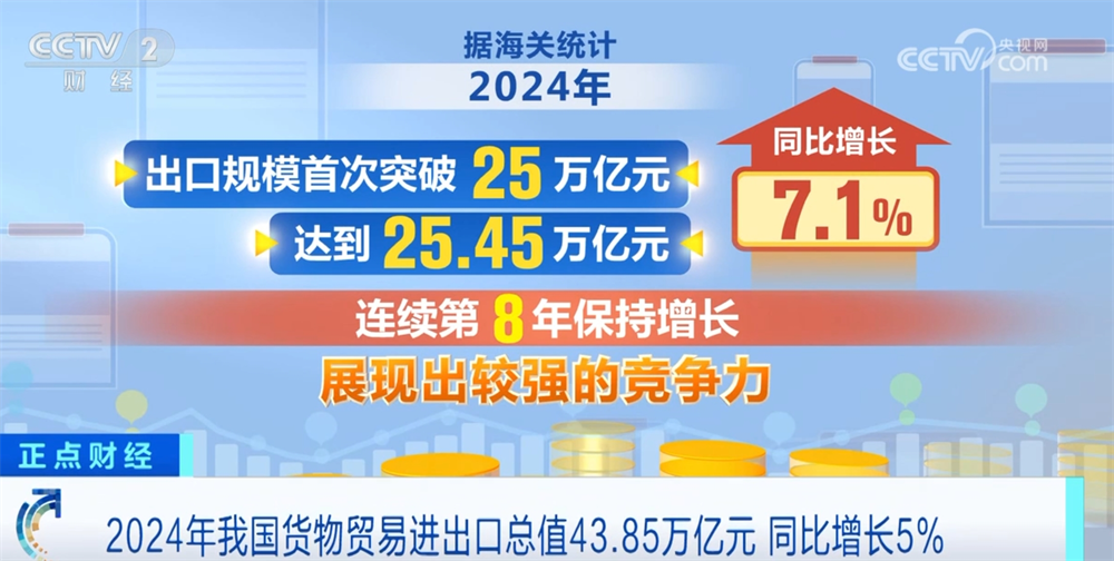 对外经贸大学中国世界商业组织研究院院长屠新泉称:“2024年我国外贸进出口成就亮眼,外贸总量、增量和质量都获得显著提拔。进出口商业额创出新高,全年实现商业顺差跨越1万亿美元。出格是这些成就是正在我国曾经具有40万亿庞大存量的根本上取得,实为难能宝贵。”正在13日上午国新办举行的旧事发布会上,2024年我国货色商业进出口总值43。85万亿元,总量、增量、质量“三量”齐升,规模再创汗青新高。2024年,我国货色商业进出口总值43。85万亿元,同比增加5%。此中,出口规模达到25。45万亿元,同比增加7。1%,持续第8年连结增加。进口18。39万亿元,同比增加2。3%。